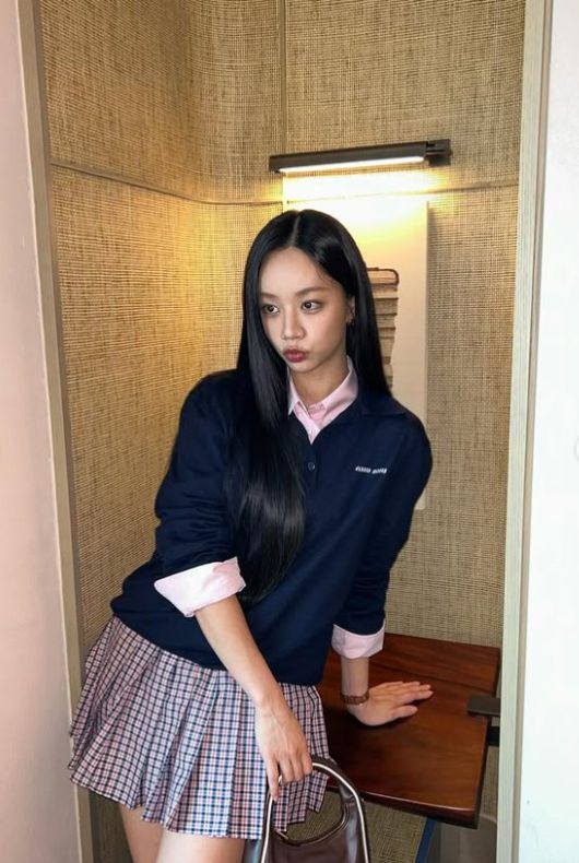 첫 번째 착장은 핑크 셔츠와 네이비 니트 스웨터를 레이어드한 룩이다. 소매를 걷어 올려 팔목을 드러내 손목 시계와 핸드백에 자연스레 시선이 가도록 했다. 여기에 체크 패턴의 플리츠 스커트를 매치해 단정하면서도 발랄한 무드를 완성했다. 밝은 색감과 클래식한 조합은 혜리의 맑은 이미지와 어우러졌다.