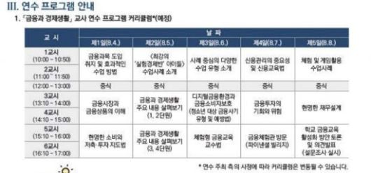 연수 대상은 '금융과 경제생활' 과목 수업을 담당할 고등학교 사회과 교사 또는 금융과목에 관심이 있는 고등학교 교사들이다.연수를 원하는 사람은 2일부터 11일까지 금감원 'e-금융교육센터' 홈페이지에서 신청하면된다.