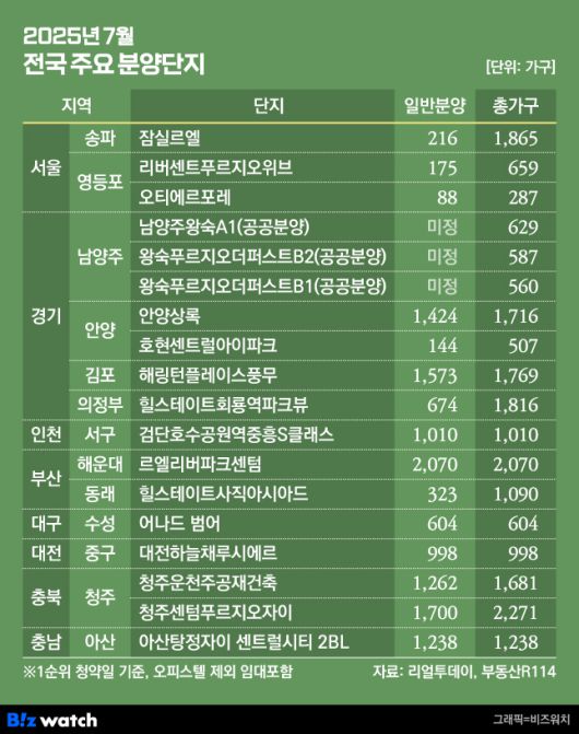 이 외에도 대전에서는 '대전 하늘채 루시에르'의 전체 가구 수인 998가구가 모두 일반분양 예정이다. 부산 해운대구에서는 '르엘 리버파크 센텀'의 2070가구가 일반분양되며 동래구 사직동에서는 '힐스테이트 사직아시아드'의 1090가구 중 323가구가 청약을 받을 예정이다.