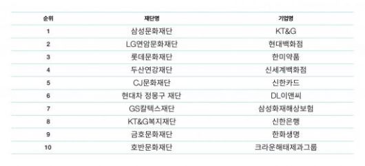 기업 출연 재단 부문에서는 삼성문화재단의 지원 규모가 가장 컸다. 삼성문화재단은 '리움미술관'과 '호암미술관'을 운영하며 겸재 정선, 필립 파레노 등 고미술 및 현대미술 작가까지 폭넓게 소개하고 있다. 지난해에는 복합문화공간 '사운즈S'를 개관해 중견 및 신진 음악가들과 다양한 장르의 공연을 선보였다. 이 외에도 악기 후원 프로그램 '삼성 뮤직 펠로우십', '피아노 조율사 양성사업' 등을 펼치고 있다.