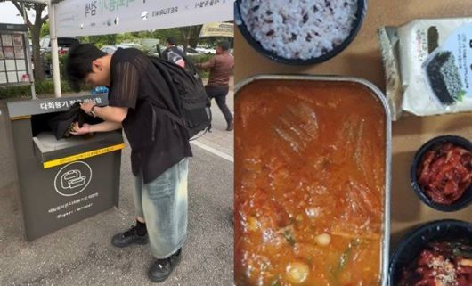 한강공원에 설치된 다회용기 전용 반납기계를 시민이 이용하는 모습(서울시 기후환경본부 공식 인스타)/어플로 주문한 음식이 다회용기에 담겨있는 모습.(배달의민족) |