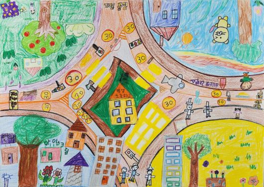 광주광역시 북구 운암3동 행정복지센터 2층 주민자치회 사무실 벽에는 경양초등학교 2학년 학생들이 크레파스로 그린 마을 지도가 걸려 있었다. 학생들은 학교를 둘러싼 도로를 따라 공원과 아파트, 편의점, 아이스크림 가게를 그려 넣었다. 그런데 모든 도로의 제한속도가 시속 30㎞다. 도화지 크기 그림에는 제한속도를 알리는 표지판 14개와 신호등 5개가 등장한다. 도로는 일방통행만 할 수 있다.
