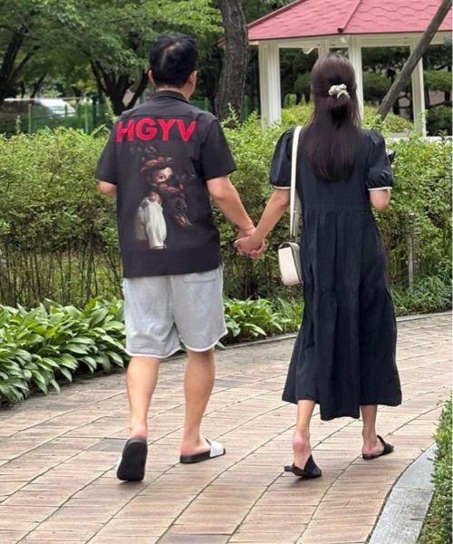 공개된 사진은 두 컷. 나란히 손을 잡고 아파트 단지 내를 걷는 장면과, 간식을 든 채 여유롭게 걸어가는 뒷모습이 이어졌다.