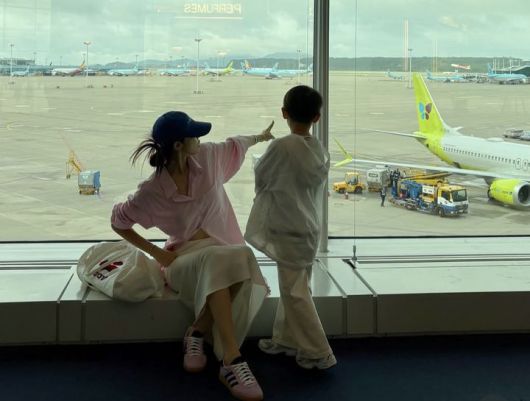 사진 속에서 서하얀과 그의 아들은 창가 너머 비행기를 가리키며 한창 대화를 나누는 모습이다.