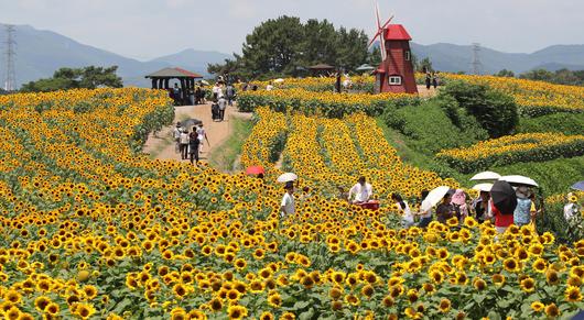 ■ 오후 2:40 무더위 속 활짝 핀 해바라기... 13회 강주해바라기축제 성황 전국적으로 무더위가 기승을 부린 2일 경남 함안군 법수면 강주해바라기마을에서 관광객들이 활짝 핀 해바라기를 구경하고 있다. 이 곳에서 진행되고 있는 제13회 강주해바라기축제는 지난달 18일부터 이날까지 열릴 예정이었지만, 개화 시기가 늦은 이유로 오는 6일까지 열린다.