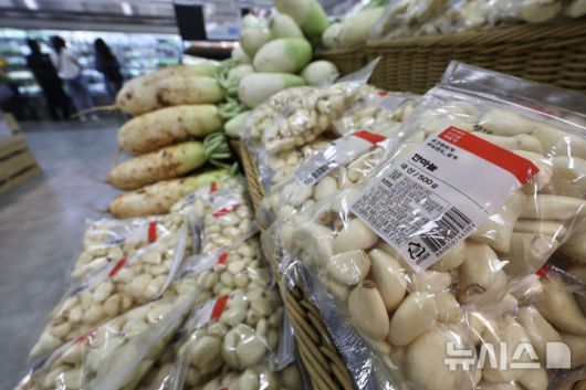[서울=뉴시스] 김명년 기자 = 서울시내 한 대형마트에 깐마늘이 진열돼 있다. 2025.05.22. kmn@newsis.com |