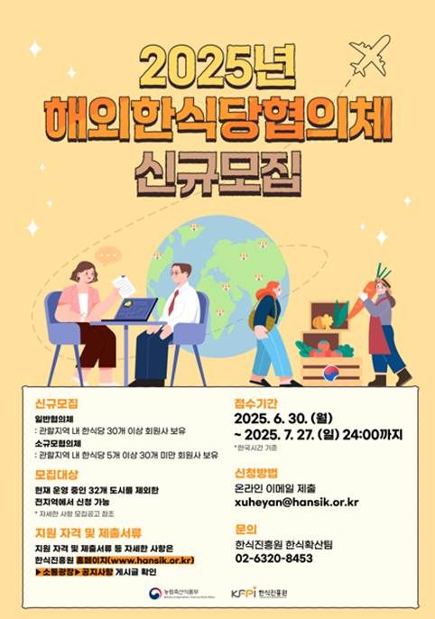 모집 분야는 △관할 지역 내 한식당 30개 이상이 참여하는 일반 협의체와 △관할 지역 내 한식당 5개 이상 30개 미만이 참여하는 소규모 협의체로 구분된다. 신청 기간은 오는 27일 자정 까지로 지원서는 이메일을 통해 온라인 접수하면 된다.