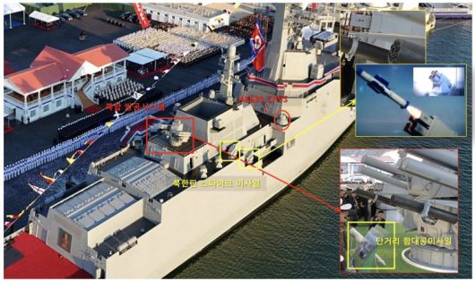 지난 4월 25일 공개된 북한의 신형 5000t급 구축함 '최현'함의 방어 무장.뉴시스