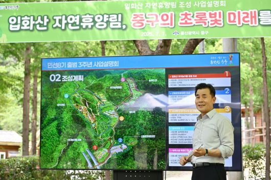 김영길 울산 중구청장이 1일 중구 다운동 입화산 자연휴양림에서 숙박과 체험 기능을 갖춘 ‘산림문화휴양관’ 조성 계획을 발표하고 있다. 울산 중구 제공 |