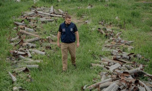 하르키우 검찰 대변인 드미트로 추벤코가 지난 4월 30일 러시아의 침공이 계속되는 가운데 하르키우와 그 인근 지역에 러시아군이 발사한 포탄 잔해들 사이를 걷고 있다. 이곳은 러시아 미사일 잔해를 보관하는 용도로 사용되는 들판이다. 하르키우/AFP 연합뉴스 |