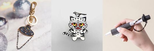 ‘뮷즈’ 문화상품의 모습. 왼쪽부터 ‘갓 키링’, ‘까치 호랑이 배지’, ‘흑립 갓끈 볼펜’. 국립중앙박물관 제공 |