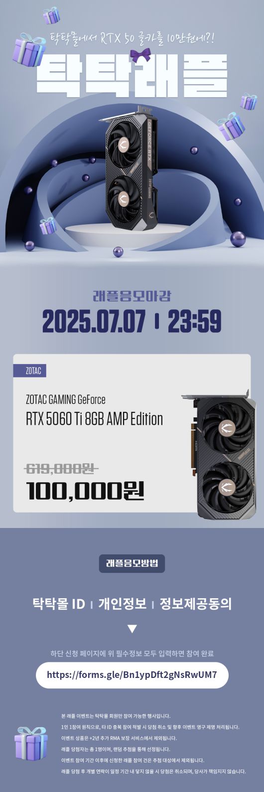 조텍 그래픽카드 래플 이벤트는 조텍코리아 공식 쇼핑몰 ‘탁탁몰’ 가입자 대상으로 진행된다. 7월 1일부터 7월 7일 23시 59분까지 신청이 가능하며, 추첨을 통해 선정된 1인은 판매가 619,000원에 만날 수 있는 제품을 100,000원에 구매할 수 있다. 이벤트 참여는 신청서 작성을 통해 가능하다.