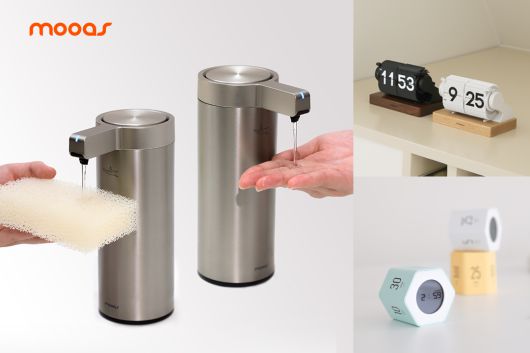사진설명 : 왼쪽부터 시계 방향으로 ‘무아스 프리미엄 슬림 메탈 젤타입 자동 디스펜서’ , ‘무아스 미니 오토매틱 멀티 플립 시계’, ‘무아스 멀티 육각 타이머’ |