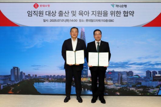 롯데쇼핑이 하나은행과 1일 서울 송파구 롯데월드타워에서 ‘임직원 대상 출산 및육아 지원을 위한 협약’을 체결했다고 2일 밝혔다. 이번 협약은 7월 11일 ‘세계 인구의 날’을 앞두고 출산 장려와 육아 지원을 위해 마련됐다.