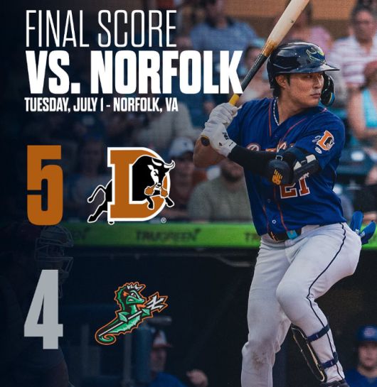 [서울=뉴스핌] 손지호 기자 = 2일(한국시간) 열린 탬파베이 산하 트리플A 더럼 불스와 노퍽 타이즈(볼티모어 오리올스 산하)의 경기 결과. [사진=더럼 불스 SNS 캡처] 2025.07.02 thswlgh50@newspim.com |