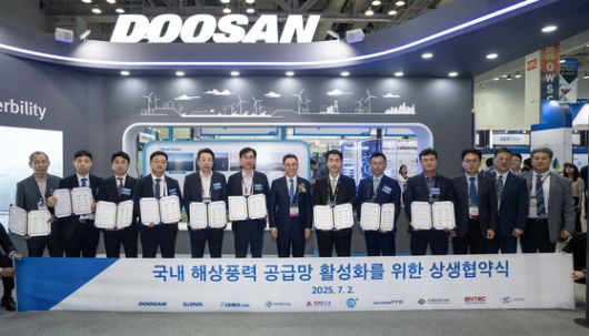 두산에너빌리티는 부산 벡스코에서 개막한 ‘2025 해상풍력 공급망 콘퍼런스 전시회’에서 국내 9개 협력사와 ‘국내 해상풍력 공급망 활성화를 위한 상생협약’을 체결했다고 2일 밝혔다. 이날 협약식엔 정연인 두산에너빌리티 부회장, 손승우 파워서비스BG장, 그리고 산일전기·삼일씨엔에스 등 9개 협력사 대표들이 자리했다.