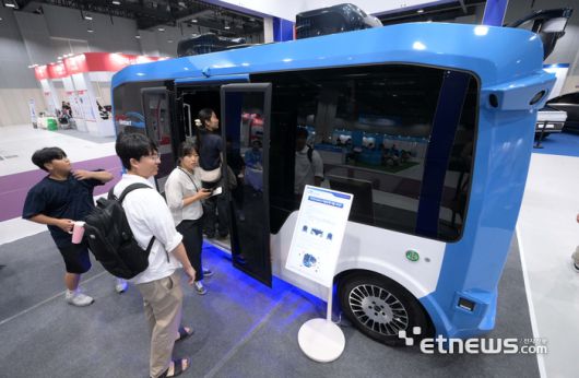 산업통상자원부가 주최한 '2025 대한민국 순환경제 페스티벌'이 2일 서울 강서구 코엑스 마곡 전시장에서 열렸다. 한국자동차연구원 부스에서 관람객이 카모 자율주행 셔틀을 살펴보고 있다. 김민수기자 mskim@etnews.com [Copyright © 전자신문. 무단전재-재배포금지]