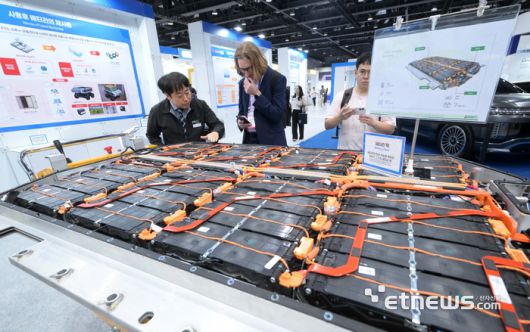 산업통상자원부가 주최한 '2025 대한민국 순환경제 페스티벌'이 2일 서울 강서구 코엑스 마곡 전시장에서 열렸다. 포엔 부스에서 관람객이 배터리의 원래 성능을 복원한 제재조 전기차 배터리 팩을 살펴보고 있다. 김민수기자 mskim@etnews.com [Copyright © 전자신문. 무단전재-재배포금지]