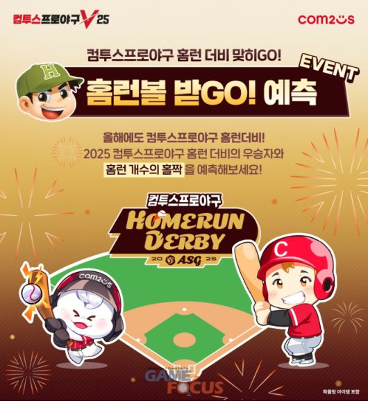 ‘컴프야V25’에서도 7월 4일부터 홈런더비 예측 이벤트를 진행한다. 공식 커뮤니티에서 ‘홈런더비 맞히GO! 홈런볼 받GO!’ 이벤트에 참여해 ‘컴투스프로야구 홈런더비’ 우승자와 홈런 개수를 조건에 맞게 예측하면 ‘라이브 5성 스카우트 티켓’ 등 게임 아이템을 받을 수 있고, 추첨 통해 선정된 50명에게는 홈런볼 제품이 지급된다.