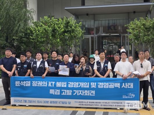 2일 KT새노조는 서울 종로구 광화문KT빌딩 이스트에서 '윤석열 정권의 KT 불법 경영개입 및 경영공백 사태 특검 고발 기자회견'을 개최했다.