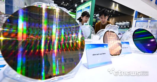 나노코리아2025가 '더 나은 미래를 만드는 나노기술'을 주제로 2일 경기 고양시 킨텍스에서 열렸다. 참관객이 한국나노기술원의 시스템반도체 웨이퍼를 살펴보고 있다. 이동근기자 foto@etnews.com [Copyright © 전자신문. 무단전재-재배포금지]