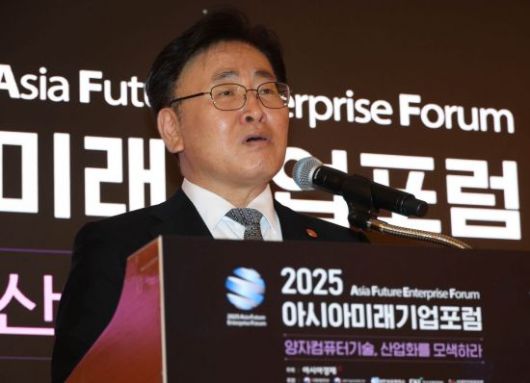 유상임 과학기술정보통신부 장관이 11일 서울 중구 롯데호텔에서 열린 '2025 아시아미래기업포럼'에서 축사를 하고 있다. 이번 포럼은 '양자컴퓨터기술, 산업화를 모색하라'란 주제로 열렸다. 2025.6.11 조용준 기자 |