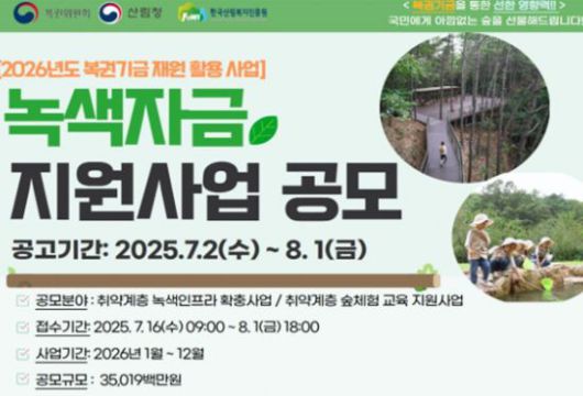 한국산림복지진흥원은 '2026년 녹색자금 지원사업'을 공모한다고 2일 밝혔다.