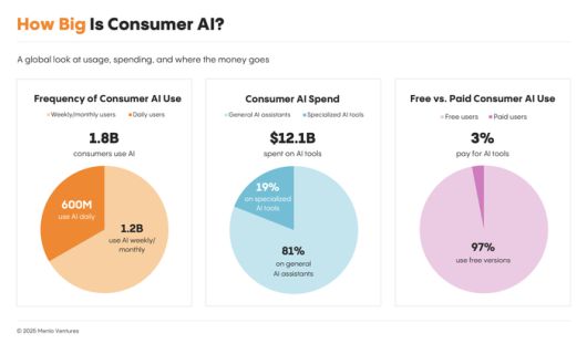 멘로벤처스는 “약 2년 반 전 챗GPT가 처음으로 전 세계에 생성형 AI를 선보인 이후, 소비자용 AI 시장은 수십억달러 규모의 시장이 됐다”라고 밝혔다. 이들이 추정한 소비자들의 연간 AI 서비스 지출은 총 121억달러(약 16조5000억원)에 달한다.