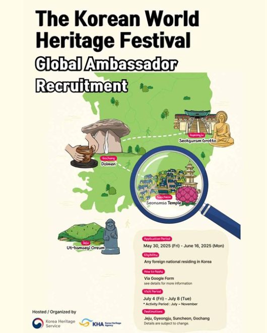 국가유산청(청장 최응천)은 국가유산진흥원(원장 이귀영)과 제주(7.4~7.22.)를 시작으로 경주(9.12~10.3.), 순천(9.12~10.3.), 고창(10.2~10.22.)에서 2025년 세계유산축전을 순차적으로 개최한다.