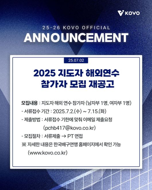 모집인원은 일본 SV.LEAGUE 또는 V.LEAGUE 남녀부 각 1명씩 총 2명이다. 이번 해외 연수에 발탁된 지도자는 2025년 9월부터 2026년 3월 초까지 약 6개월 동안 일본 구단 파견 코치로 활동하게 된다. 연맹은 왕복 항공권, 숙박비 및 현지 체재비를 지원할 예정이다.