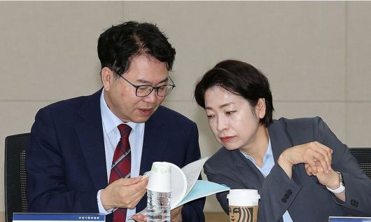 국정기획위원회 이한주 위원장이 지난달 19일 정부세종컨벤션센터에서 열린 경제2분과의 산업통상자원부 업무보고에서 황정아 위원과 함께 자료를 살펴보고 있다. 연합뉴스 |