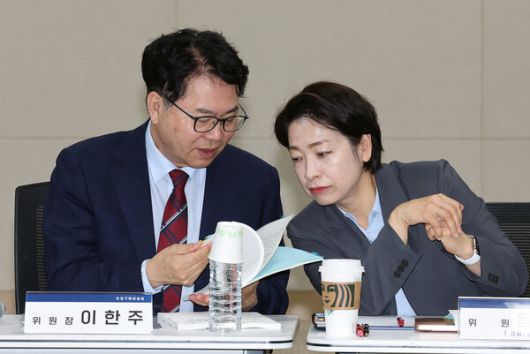 국정기획위원회 이한주 위원장이 지난달 19일 정부세종컨벤션센터에서 열린 경제2분과의 산업통상자원부 업무보고에서 황정아 위원과 함께 자료를 살펴보고 있다. [사진: 연합뉴스] |