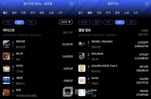 실시간 음악차트 한터차트는 1일 오전 10시, 2025년 6월 월간차트를 발표했다. 이에 따르면 엔하이픈이 한터차트 6월 월간차트 각 부문 1위에 등극했다.