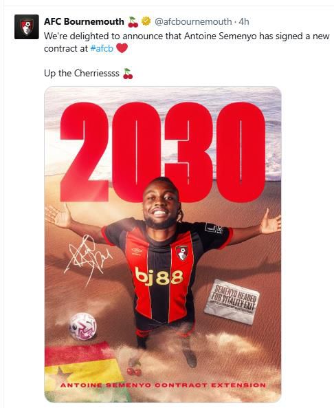 본머스는 2일 구단 홈페이지에 "세메뇨와 2030년 여름까지 새로운 장기 계약을 체결했다"고 알렸다.