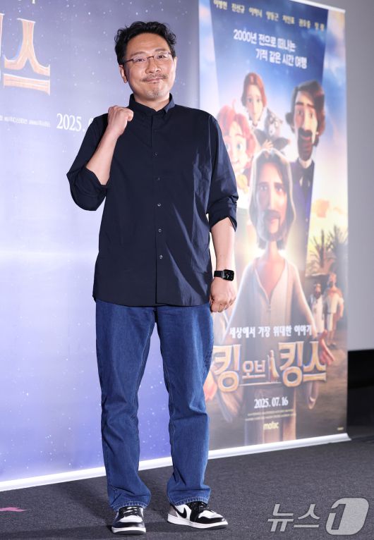 (서울=뉴스1) 권현진 기자 = 장성호 감독이 2일 오후 서울 용산구 CGV용산아이파크몰에서 열린 애니메이션 '킹 오브 킹스' 언론시사회 및 기자간담회에서 포즈를 취하고 있다. '킹 오브 킹스'는 영국의 뛰어난 작가 찰스 디킨스가 막내아들 월터와 함께 2000년 전 가장 위대한 이야기 속으로 떠나는 여행을 그린 글로벌 흥행작 K-애니메이션이다. 2025.7.2/뉴스1