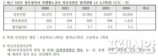▲최근 5년도 광주광역시 학생별도검사 척추측만증 발견 현황.2025.07.02ⓒ학벌없는 사회를 위한 시민모임 |