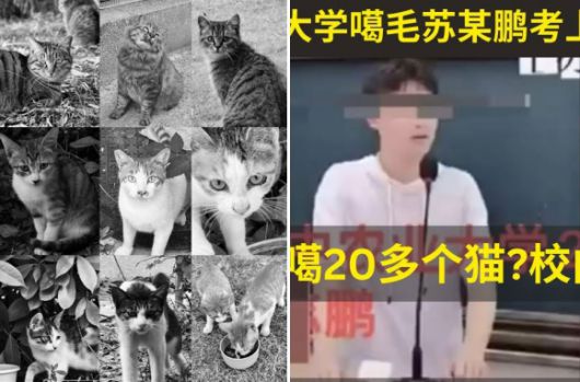 중국 화중농업대학 캠퍼스에 살던 길고양이들(왼쪽)과 이 동물들을 학대해 살해한 의혹이 있는 남성 수 모 씨. 출처=웨이보·유튜브 |