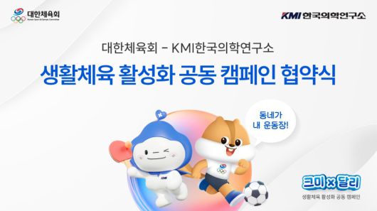 양 기관은 대표 캐릭터인 '달리'(대한체육회)와 '크미'(KMI)를 활용한 3D애니메이션을 제작해 생활체육의 필요성과 가치를 국민들에게 널리 알리고, 대한체육회 주최 행사 내 공동 홍보관 운영, 미래건강검진 구역 운영 등 다양한 협력사업을 통해 생활체육과 건강검진의 중요성을 적극 알릴 계획이다.