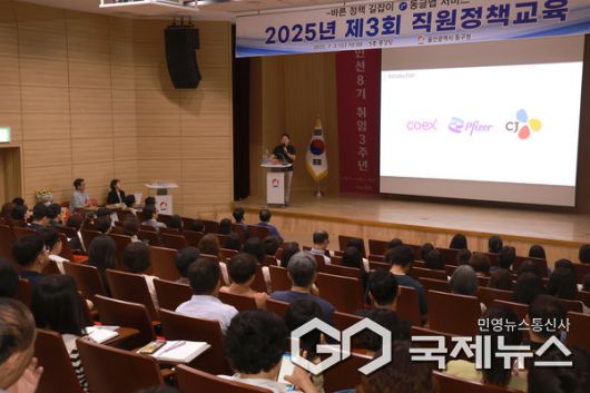 (울산=국제뉴스) 주영곤 기자 = 울산 동구는 7월 2일 오전 10시 동구청 5층 중강당에서 전 직원을 대상으로 '직원들의 바른 정책 길잡이: 2025 동글맵 서비스' 제3회 직원 정책교육을 진행했다.