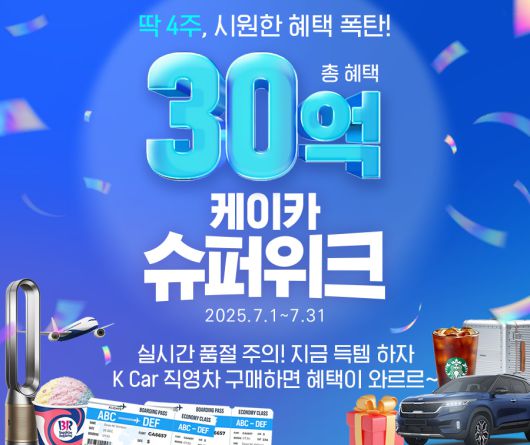 정인국 케이카 사장은 "여름 휴가철을 맞아 고객들이 실질적으로 체감할 수 있는 풍성한 혜택과 다양한 경품을 준비했다"며 "향후에도 고객 중심의 다양한 프로모션을 통해 만족스러운 중고차 구매 경험을 할 수 있도록 노력할 것"이라고 밝혔다.