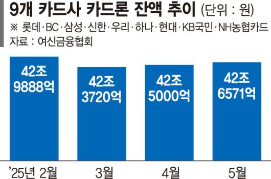 여신금융협회에 따르면 9개 카드사(롯데·BC·삼성·신한·우리·하나·현대·KB국민·NH농협카드)의 지난 5월 말 기준 카드론 잔액은 42조6571억원으로, 전월 대비 0.4% 늘었다. 2개월 연속 증가했다. 카드론은 올해 2월 말(42조9888억원) 역대 최대를 경신하고 3월에는 분기 말 부실채권 상각 등 효과로 감소했다가 4월부터 다시 늘고 있다.