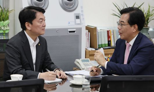 野 쇄신 어떻게… 국민의힘 송언석 비상대책위원장 겸 원내대표(오른쪽)와 당 혁신위원장에 내정된 안철수 의원이 2일 오후 국회 본청 원내대표실에서 만나 대화를 나누고 있다. 허정호 선임기자 |