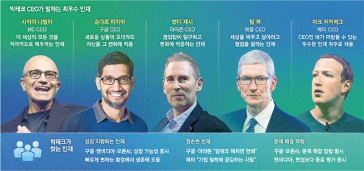 빅테크 기업 CEO들이 강조하는 인재상을 살펴보면 공통점이 발견된다. 능동적으로 행동하면서 변화에 빠르게 적응하는 인재를 선호한다는 점이다. 사티아 나델라 마이크로소프트(MS) CEO와 순다르 피차이 구글 CEO는 원하는 인재상으로 ‘모든 것을 배우고 또 성장할 의지가 있는 사람’을 꼽았다. 이는 앤디 재시 아마존 CEO, 팀 쿡 애플 CEO가 말하는 ‘끊임없이 탐구하고 세상을 바꾸고 싶어하는 인재’와도 맞닿아 있다.