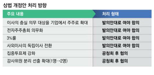 애초 여당의 상법 개정안은 △이사의 충실 의무 확대 △전자주주총회 의무화 △사외이사의 독립이사 전환 △3%룰 △집중투표제 강화 △사외이사인 감사위원 분리 선출을 1명에서 2명 이상으로 확대 등 6개 부분이 핵심인데, 여야는 앞의 쟁점 3개에 대해서는 일찌감치 합의하고 이날까지 나머지 3개를 놓고 협상을 벌여왔다.