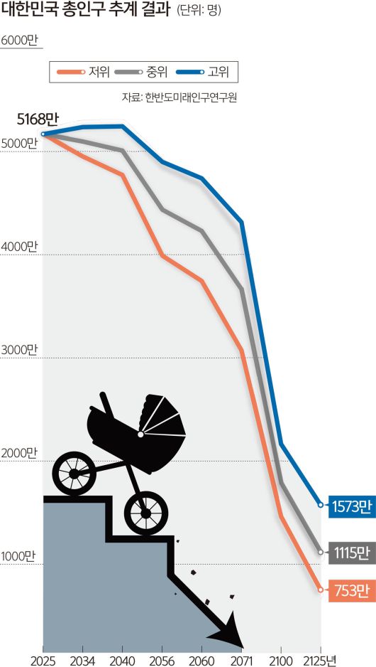 한반도미래인구연구원은 이 같은 전망을 담은 ‘2025 인구보고서: 대한민국 인구 대전환이 온다’를 2일 발간했다. 연구원은 올해부터 2125년까지 100년간 장기 인구 변화를 코호트 요인법으로 추정했다.