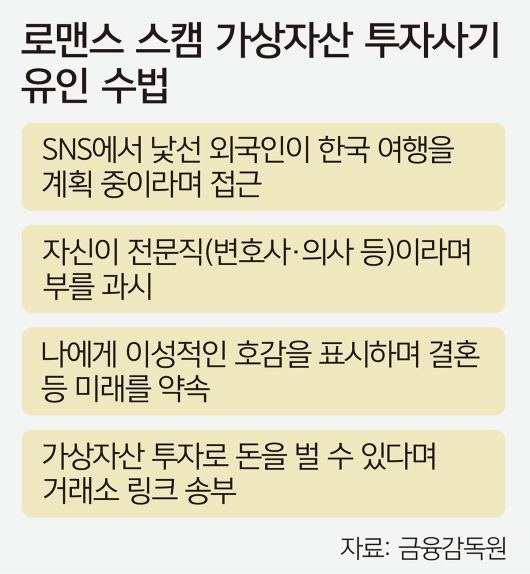 1일 금감원에 따르면 최근 가짜 가상자산거래소를 활용한 로맨스 스캠 사기범들은 사회관계망서비스(SNS)와 데이팅앱에서 주로 활동한다. 한국여행을 준비 중인 일본인이나 태국인, 한국계 미국인 등이라고 속이고 피해자들에게 접근한다. 특히 이 과정에서 인플루언서의 사진 등을 도용해 매력적인 이성으로 위장하고, 피해자와 일상적인 대화를 이어가며 피해자에게 호감을 표시한다.