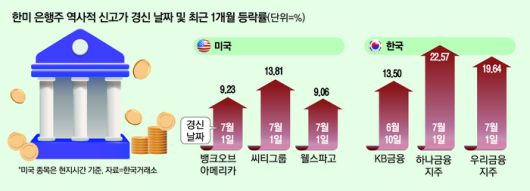 주주환원 매력에 힘입은 한국과 미국의 은행주들이 최근 최고가 경신 행진을 이어가고 있다.