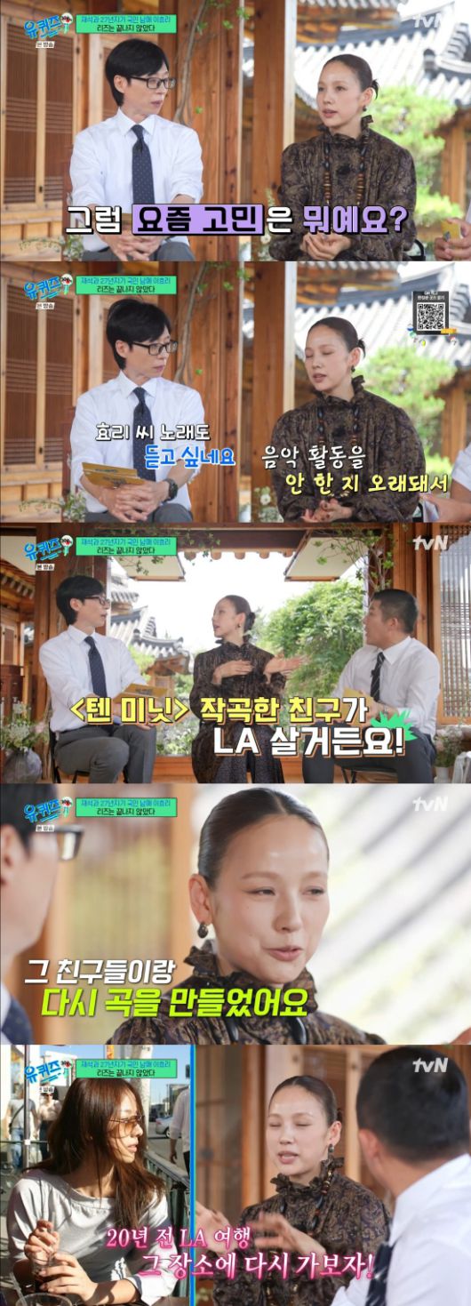 유재석은 "이효리 씨 노래도 듣고 싶다"라며 공감했고, 이효리는 "그걸 안 한 지가 많이 돼서. 제주도에 있을 땐 음악 하는 친구들도 많이 멀어지고 서울 와서 여건이 되니까 얼마 전에도 미국에 있는 친구들도 만나고 아이디어 회의하고 제가 LA에서 20년 전에 찍은 뮤직비디오가 있다. 아직도 사람들이 이효리 LA 사진 해서. 그 '텐 미닛(10 Minutes)' 작곡가가 LA에 산다. 그 친구랑 '텐 미닛' 작사한 메이비라는 친구도 저랑 동갑이다. 그때 히트를 확 치고 각자 생활을 하지 않았냐. 그 친구들이랑 곡을 하나 만들었다"라며 컴백을 예고했다.