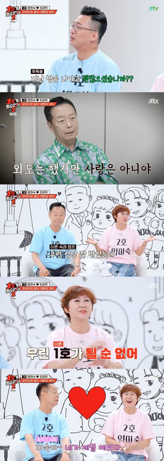 2일 방송한 JTBC '1호가 될 순 없어2'(이하 '1호가')에서는 지난주 이호선 교수에게 부부 상담을 받은 김학래, 임미숙 부부의 이야기가 전파를 탔다.