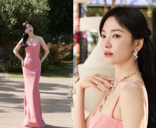 이날 공개된 사진 속에는 핑크색 민소매 드레스를 입고 우아한 분위기를 자아내고 있다. 가녀린 어깨 라인과 잘록한 허리가 돋보이는 가운데, 화려한 주얼리들이 시선을 사로잡는다.